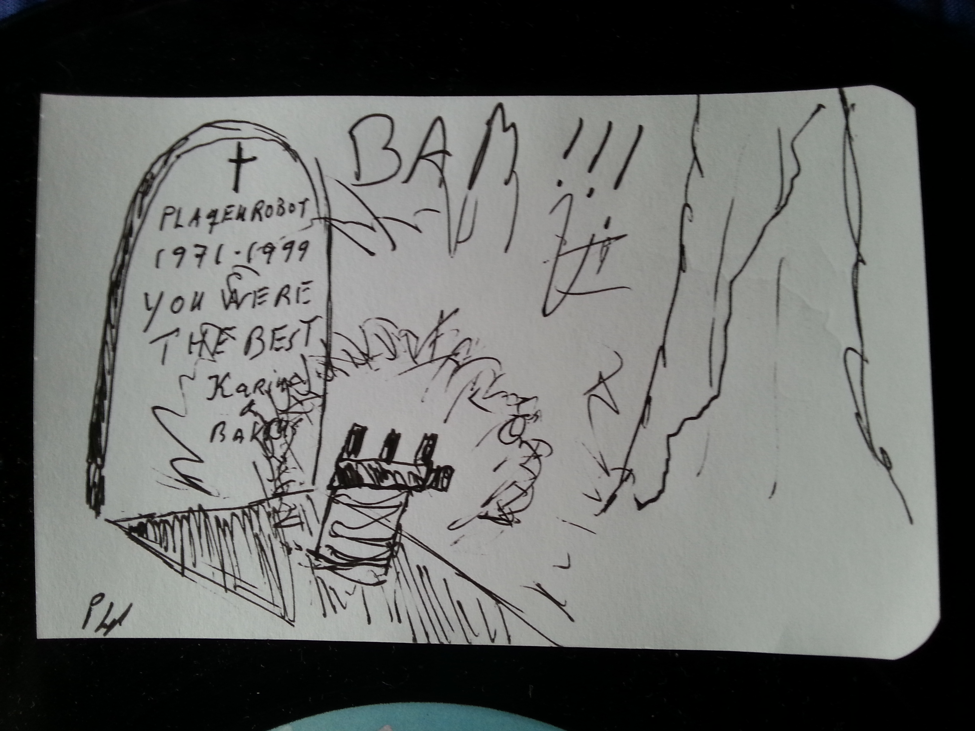 Life had reached the core of the now mutilated robot. However things were not the same anymore. The confused and not yet fully aware Plaquerobot could not fully remember what had happened ten years ago at the incident. Karius and Baktus was thrilled to met their former leader, the P-1000. They senior Plaquistadores got surprised and noticed a change in behaviour of the robot. The first command of the Plaqurobot, was to: “get down and boogie!” All of a sudden the P-1000 wouldn´t only care for spreading gum desease. It was also time jazz things up, find even hoppier IPA, dig records and Razz as many women and men as possible with bad jokes. To symbolize this knew interest, the Plaquerobot began wearing some good sounding headphones and replatted its original P-1000 sign with a P-1210 sign. A tribute to the worlds best record player of all time. (Upon investegating what happened to the Plaquerobot at the incident, studies has shown that a horrible short circuit occured which led to the passion for music, bad jokes and more hoppy beer)